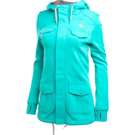 On stellar spring days, ditch your puffy for the DC Women's Fortress Fleece Jacket. A water-repellent coating keeps you dry when you crash and burn, and a thermal lining ensures you don't get the shivers while waiting for your turn to hit the pipe. Thumbhole cuffs block out snow and give your gloves a smooth fit. Its long fit, hood, media pocket, and multiple external pockets provide comfort and convenience when you're riding the lift or rocking out slashing some spring corn turns.